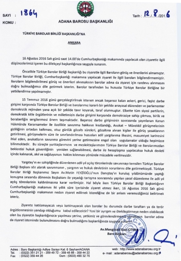 İşte Adana Barosu tarafından TBB'ye gönderilen o yazı;