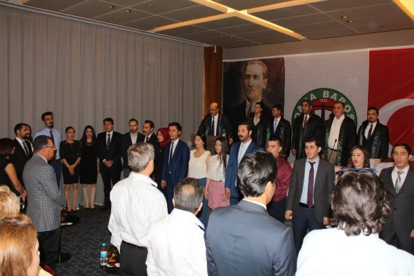 Baro Yönetim Kurulu Üyesi Av. Sabahattin Gümüş'ün meslek yemin metnini okuyup, stajyer avukatların hep birlikte tekrarlamasıyla stajyerler avukatlığa adım attılar.