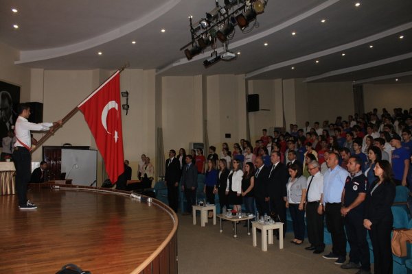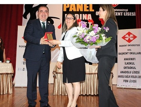 Konuşmasının ardından Okul Müdürü Dr. Esma Çalık tarafından Baro Başkan'ımıza teşekkür plaketi ve çiçek sunuldu.