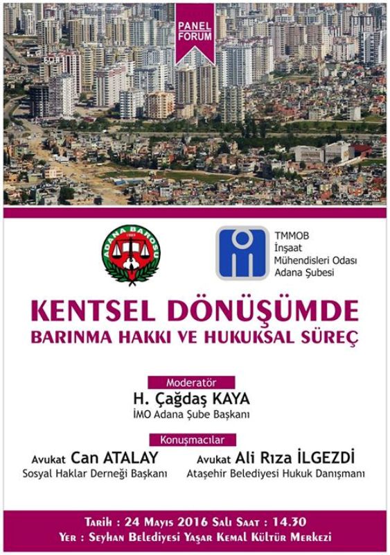 Adana Barosu ve İnşaat Mühendisleri Odası'nın (İMO) birlikte ; 24 Mayıs 2016 Salı günü Seyhan Belediyesi Yaşar Kemal Kültür Merkezi 'nde saat :14.30'da düzenleyeceği "Kentsel Dönümde Barınma ve Hukuksal Süreç" başlıklı Panel