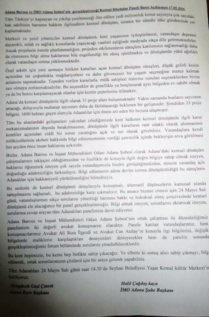 Adana Barosu ve İnşaat Mühendisleri Odası'nın (İMO) birlikte ; 24 Mayıs 2016 Salı günü Seyhan Belediyesi Yaşar Kemal Kültür Merkezi 'nde saat :14.30'da düzenleyeceği "Kentsel Dönümde Barınma ve Hukuksal Süreç" başlıklı Panel ile ilgili Baro Başkan'ımız Av. Mengücek Gazi Çıtırık ve İMO Adana Şube Başkanı H.Çağdaş Kaya , Çukurova Gazeteciler Cemiyeti'nde ortak basın açıklaması yaptılar.