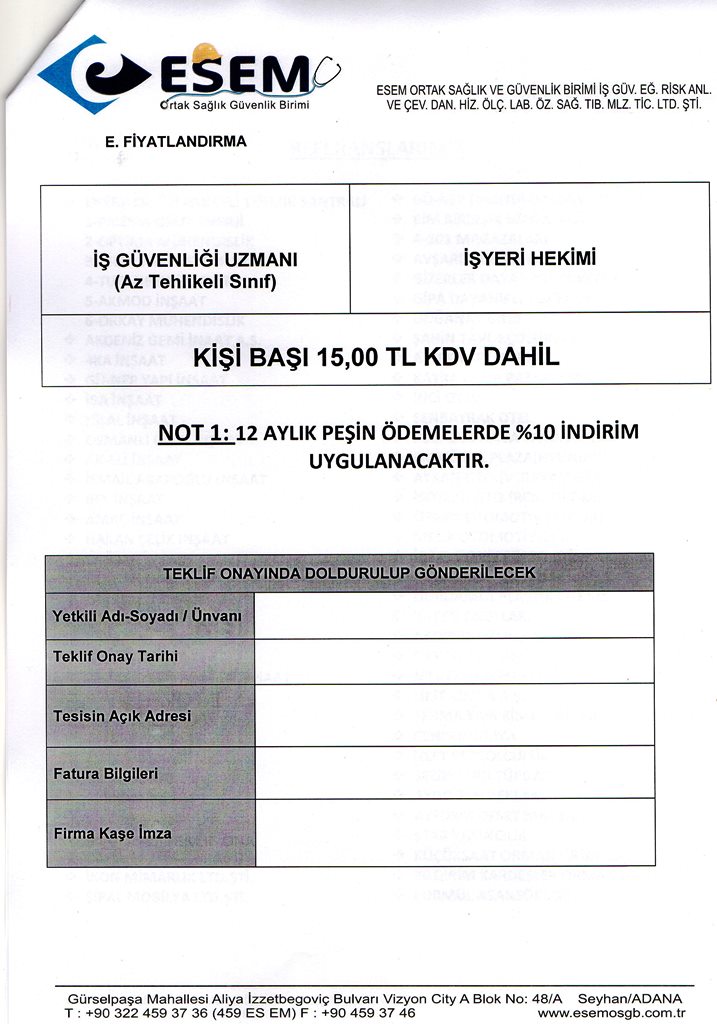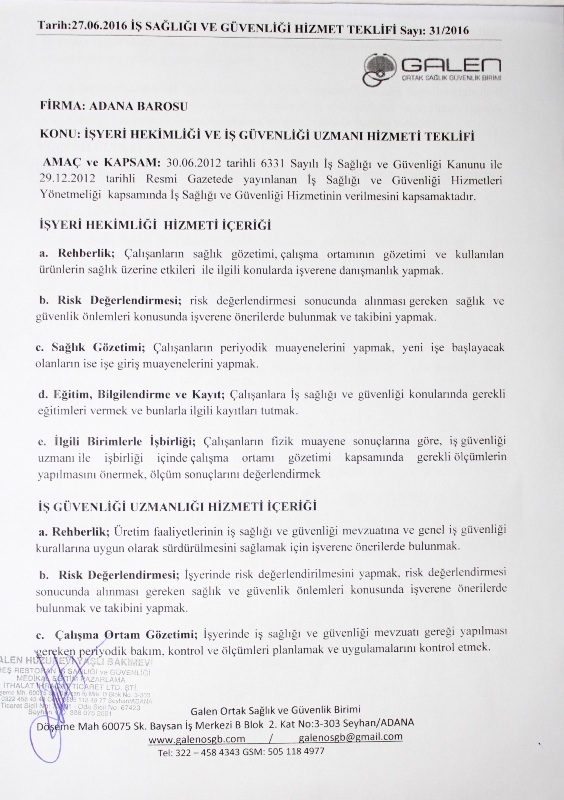 Adana Barosu Yönetim Kurulumuz 28 Haziran 2016 tarihinde İş Güvenliği konusunda toplantı yaptı. Baromuza teklif veren firmalar aşagıdadır.