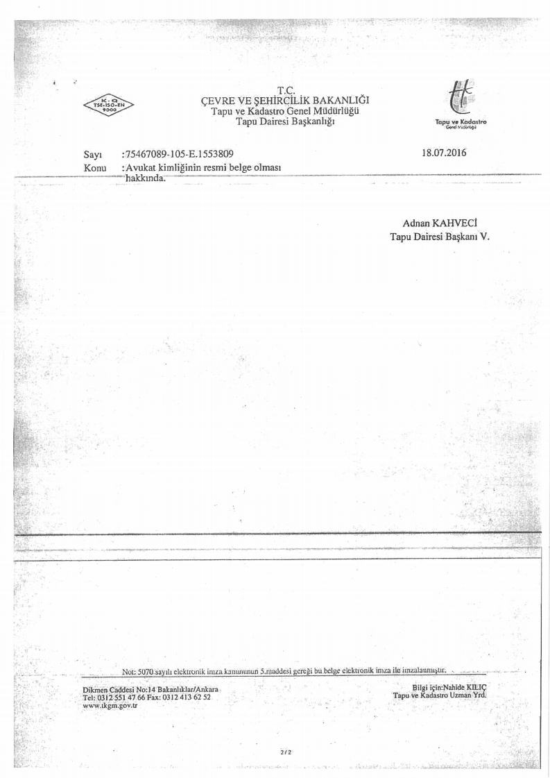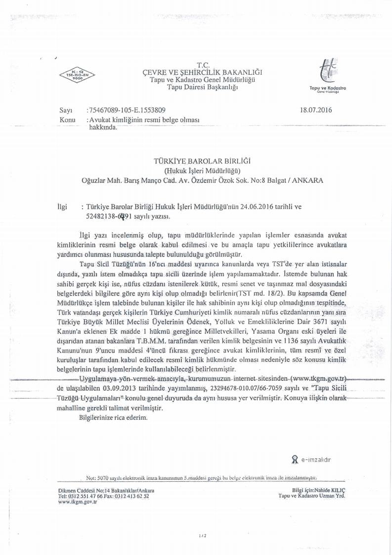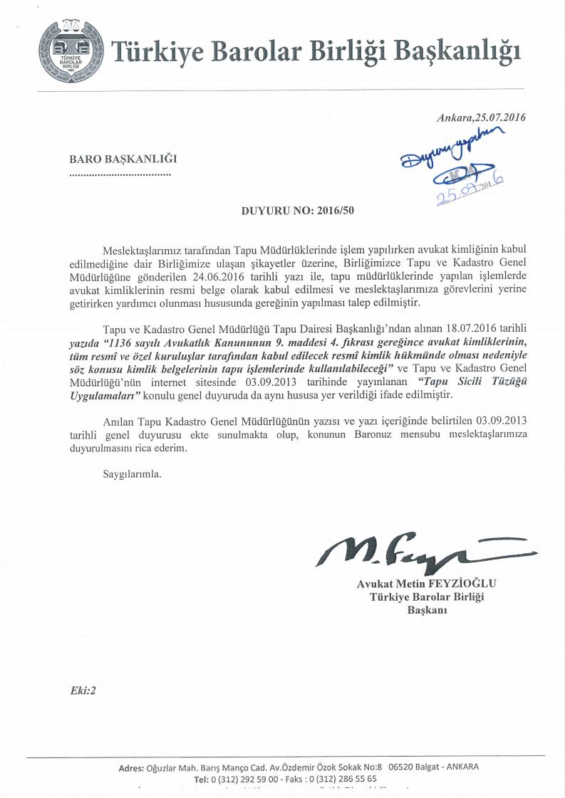 T.B.B. Duyuru 2016/50 "Tapu Müdürlüklerinde yapılan işlemlerde avukat kimliklerinin resmi belge olarak kabul edilmesi hakkında..."